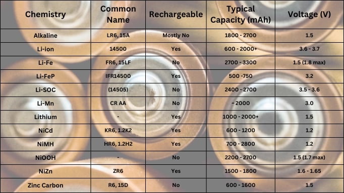 Pil kapasitesi, çeşitli faktörler ve sebeplerden dolayı farklı pil tiplerinde değişiklik gösterir. İşte size farklı kimyalara sahip pillerin kapasitesini gösteren bir tablo.